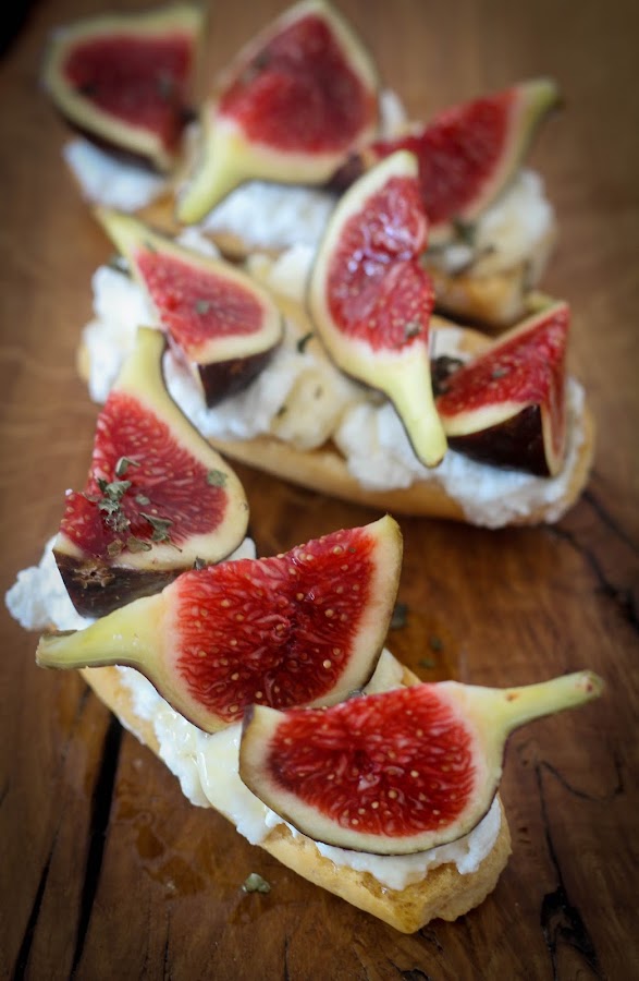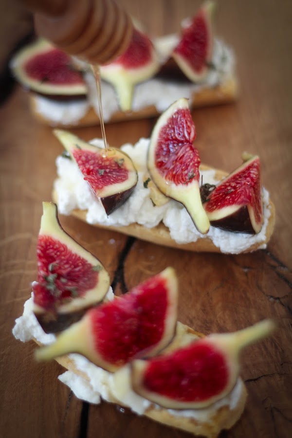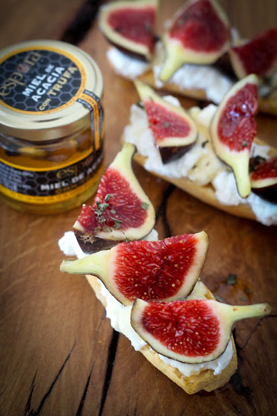 Partimos cada higo en tres porciones y los repartimos uniformemente encima del queso. Este tipo de higo es el que más me gusta con diferencia, su sabor es muy dulce y su color rojo enamora con sólo verlo. Vertemos encima una cucharadita de miel, yo he usado una miel de acacia con trufa, pero cualquier variedad de miel le quedará perfecta. Finalmente esparcimos unas hojitas de menta seca por encima. A disfrutar.