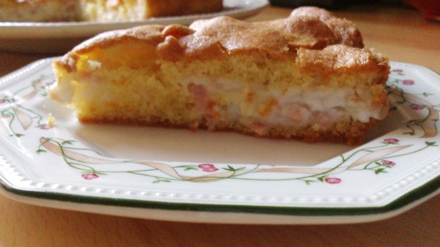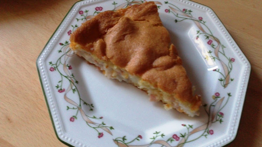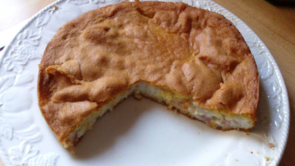 Ahora levantamos la bechamel del molde donde la teníamos y engrasamos el molde con mantequilla y ponemos un poquito de harina para que no se pegue. Echamos la mitad de la masa del bizcocho, nivelamos y a continuación colocamos con cuidado la bechamel encima de la capa de masa. Por último echamos la otra mitad de masa encima de la bechamel. Nivelamos y ya podemos introducirlo en el horno.