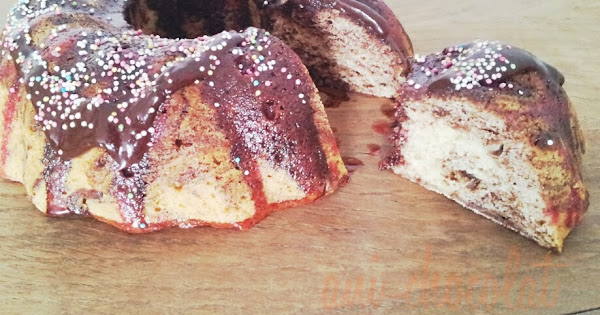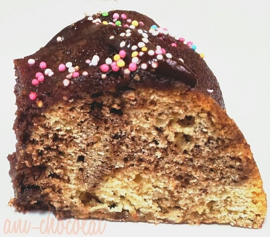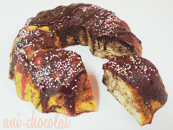 Mezclamos las almendras molidas con la harina. Batimos los huevos con el azúcar y el estracto de vainilla, hasta que doble su volumen. Incorporamos poco a poco la mezcla de harina, removiendo lentamente. Añadimos el chocolate y removemos un par de veces para crear el efecto mármol. Vertemos la mezlca en el molde y metemos en el horno unos 30 minutos o hasta que esté firme (esto, una vez más, dependerá de nuestro horno). Dejamos enfriar en el molde unos 10 minutos y desmoldamos sobre una rejilla, hasta que enfríe. Para cubrirlo, calentamos un vasito con agua, mezclamos el azúcar glass con el cacao y echamos muy poco a poco el agua, removemos, hasta tener una textura apta para cubrir. Que lo disfrutéis.