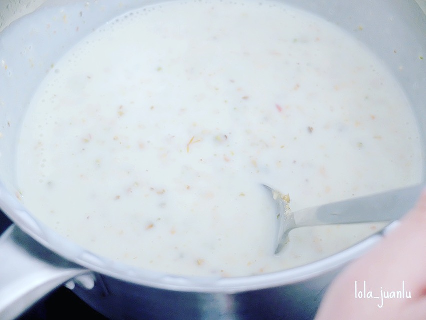 Agregamos la mezcla de leche, harina y azafrán y cocemos durante 5 minutos más sin dejar de remover.