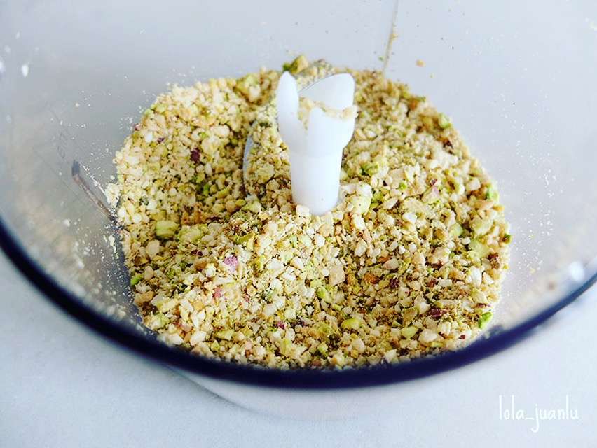 Lo primero que vamos a hacer es preparar los ingredientes, para ello sacamos el fruto de los pistachos y lo introducimos en un vaso de un procesador de alimentos. Agregamos las almendras y picamos. Reservamos.