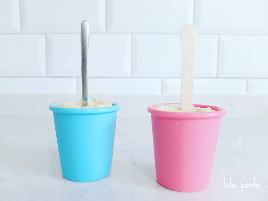 Si no tenemos moldes de helado, podemos utilizar unos moldes para flanes y como palo, unos de madera o unas cucharillas.
