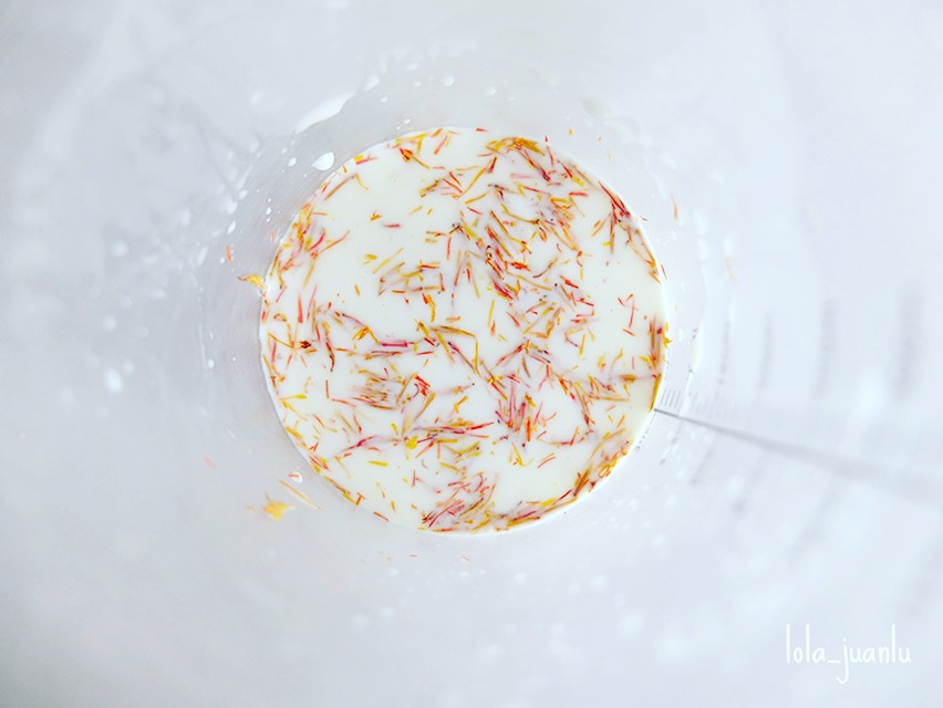 A continuación, en un baso o cuenco, disolvemos la harina de maíz en 40 mililitros de leche. Añadimos el azafrán, removemos y reservamos.