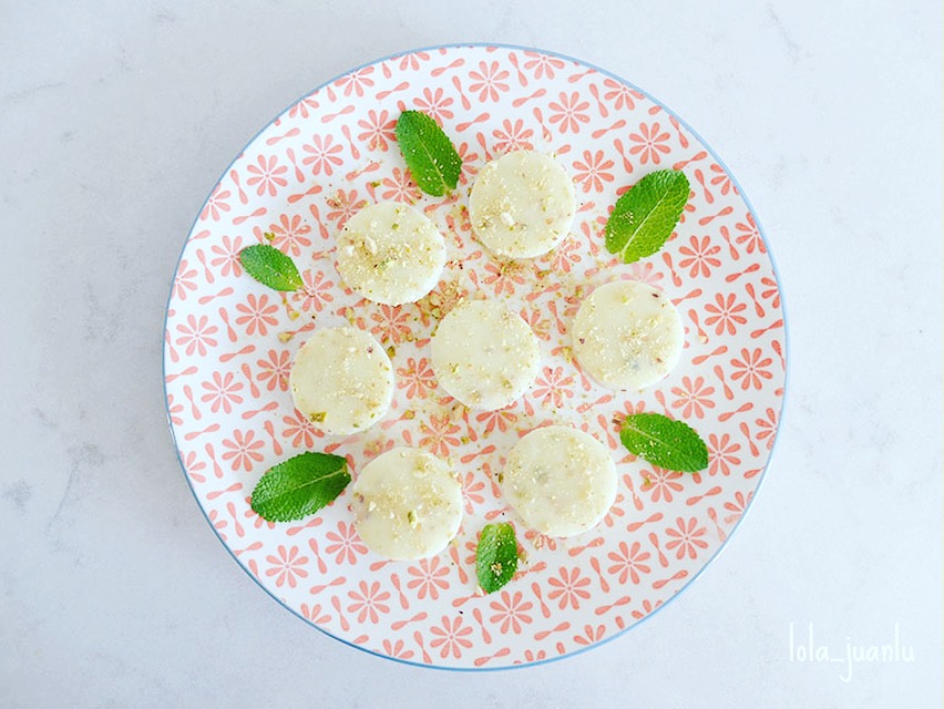 Los bombones los servimos en un plato, espolvoreamos un poco de frutos secos picados y decoramos con unas hojas de menta.