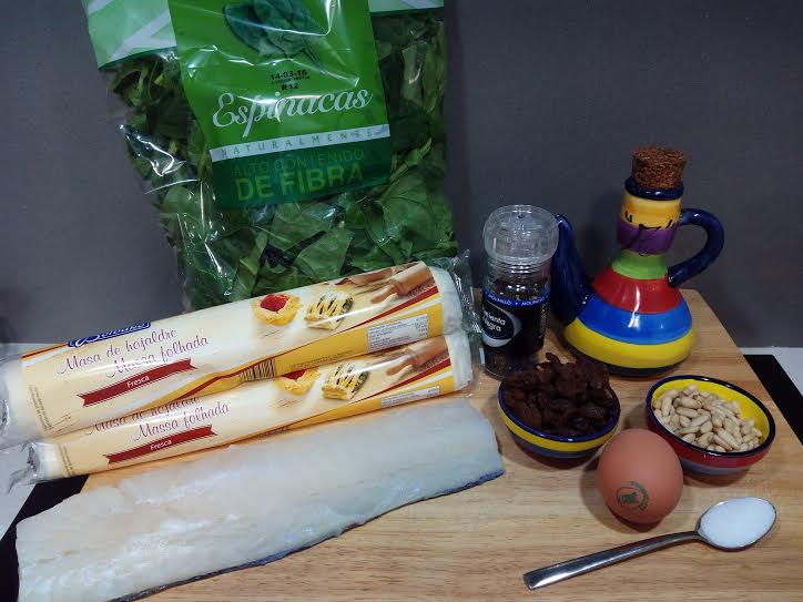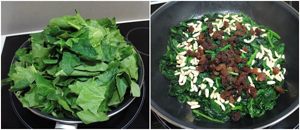 En una sartén con un chorrito de aceite rehogamos las espinacas, añadimos las pasas, los piñones y salteamos. Sazonamos al gusto y reservamos.