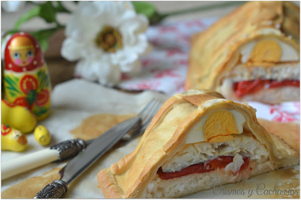 Para el montaje: Dividir la masa en dos partes. Estirar una de ellas (no dejar muy fina) medir con el filete de bacalao para saber más o menos lo que ocupa (yo hice una marca fina) quitar el filete y poner en ese hueco el arroz cocido y frío, una generosa capa.Encima los pimientos de piquillo escurridos de su jugo. Poner encima el filete que tendremos bien seco (yo lo puse en papel de cocina). Por encima los huevos cocidos cortados a la mitad (colocar a la larga) y por último hacer un majado de ajos y pimentón y echar por encima de todo ello (poner en una sartén un poco de aceite cuando este caliente freír en ella los dientes de ajo en láminas, cuando estén casi dorados separar del fuego y añadir el pimentón).