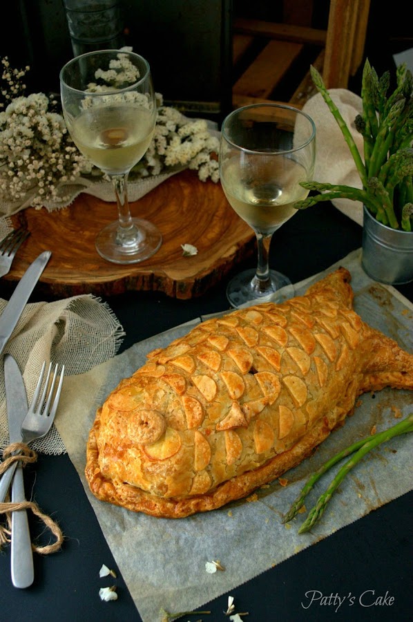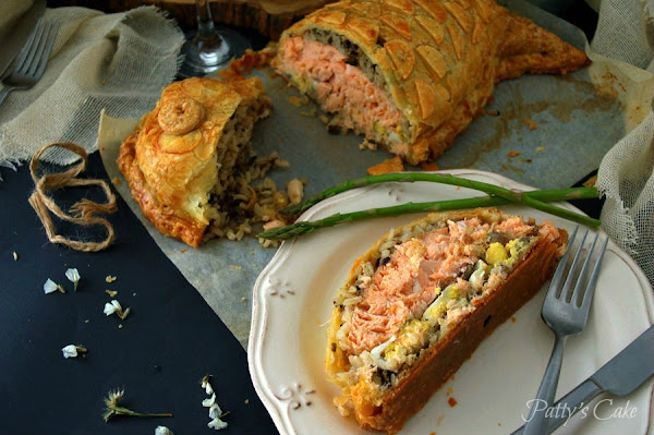 En el siglo XIX, los chefs franceses descubrieron este fabuloso pastel y el maestro Escoffier lo incluyó en su "Biblia" de 1903 con el nombre más afrancesado de "coulibiac". A partir de entonces, el pastel ruso se paseó por toda Europa. Hoy en día, no sólo se hace con masa de pan, sino también con hojaldre, como el que yo he hecho, y con rellenos diversos, aunque los básicos son un pescado (salmón, bacalao,...), arroz, huevos duros y champiñones.