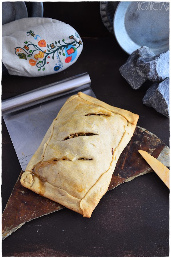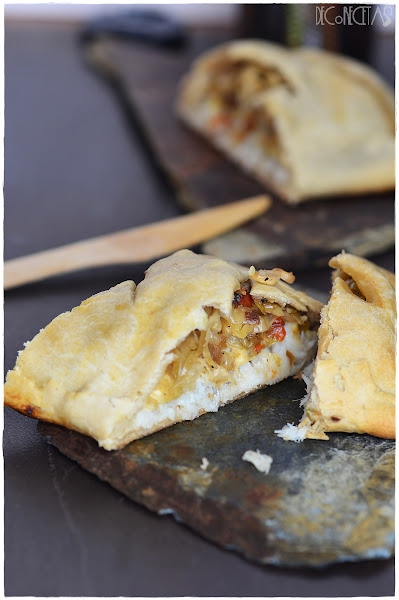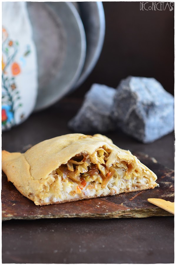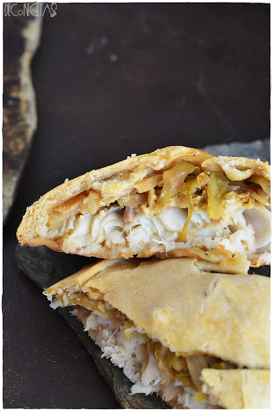 Para realizarlo utilice la masa de las empanada argentinas y de pescado, abadejo, que es el que siempre tengo congelado en la nevera. Luego hice un salteado de cebolla, pimiento rojo y verde, y finalmente col en juliana con un chorrito de salsa de soja. Puse la mitad de la masa estirada con un rodillo, encima el pescado, el salteado de col y tapé con la otra mitad de masa. Llevé al horno por 30 minutos a 170º