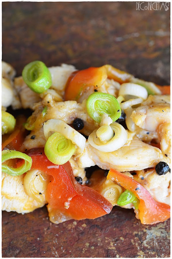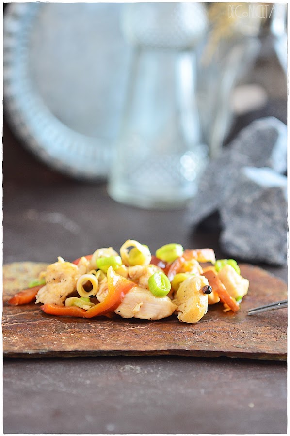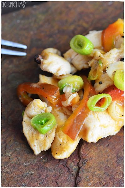 Primero añadimos al pollo en tiras pimienta blanca molida y harina de maiz reservandolo. En un wok añadimos las bolitas de pimienta y la guindilla. Después agregamos el pollo y salteamos hasta que esté listo. En ese momento, agregamos la cucharada de vino blanco, el pimiento rojo y la cebolleta, y la salsa dejando cocinar conjuntamente por 2 minutos