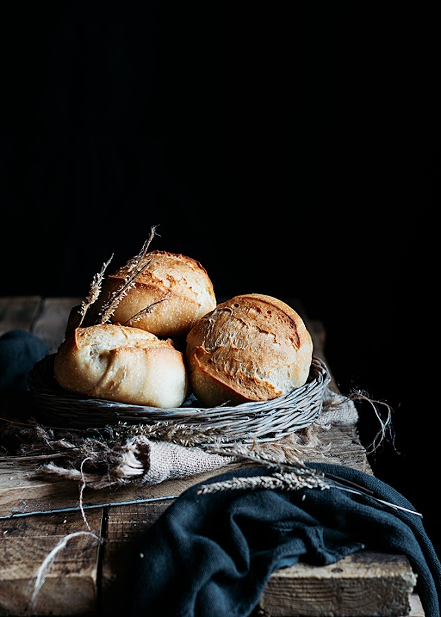 Darle forma de salchicha a cada bola de masa y estirarlas con el rodillo a lo largo dejándola de 1 cm. de grosor. Enrollar cada tira como si fuera un caracol. Colocar los panes en una bandeja de horno y meterlos tapados en la nevera toda la noche.