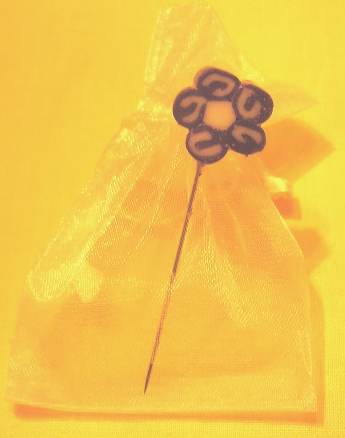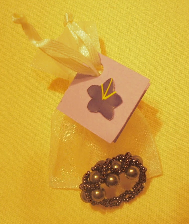 Más tarde la novia repartió los detalles de las invitadas hechos por ella: unos alfileres de violetas de fimo que los llevaba en una margarita de fieltro superchula y que no tengo fotos de ella, y unos anillos también hechos a mano . Como se lo curró, el detalle de la violeta en la bolsa era total. Para los chicos una botella de vino de la tierra.