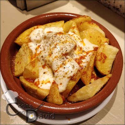 Patata crujiente y cremosa, coronada con una salsa suave y fina, otra picantita y especias. Muy buenas, bravas "estilo Barcelona" que son top de la ciudad vallisoletana.