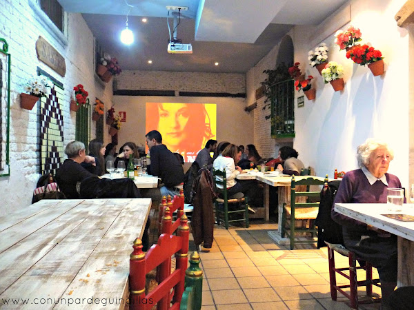 Al fondo del espacio, ocupando toda la pared, una gran pantalla reproduce actuaciones de grandes artistas del Flamenco y como yo no soy un experto en estas lides no diré quién sonó cuando allí estuvimos, lo que si que puedo deciros es que el volumen no molesta, no está alto y se puede mantener perfectamente una conversación con tus compañeros de mesa.