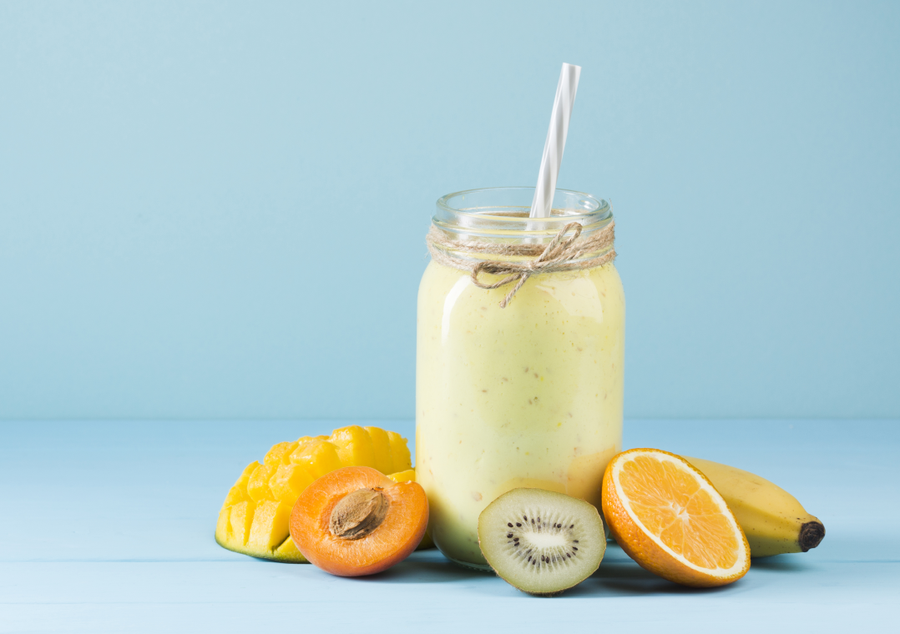 Introducimos las claras en el microondas durante un minuto aproximadamente. A continuación, las mezclamos en el vaso de la batidora junto al resto de los ingredientes: la leche, el plátano y los yogures, y batimos hasta obtener una mezcla homogénea.