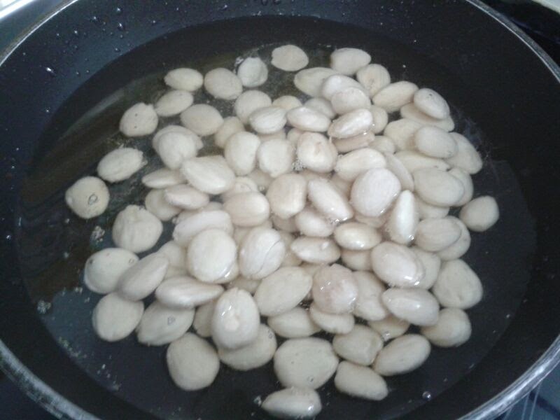 Freímos las almendras en aceite de girasol y las ponemos sobre papel de cocina para que no tengan nada de grasa.