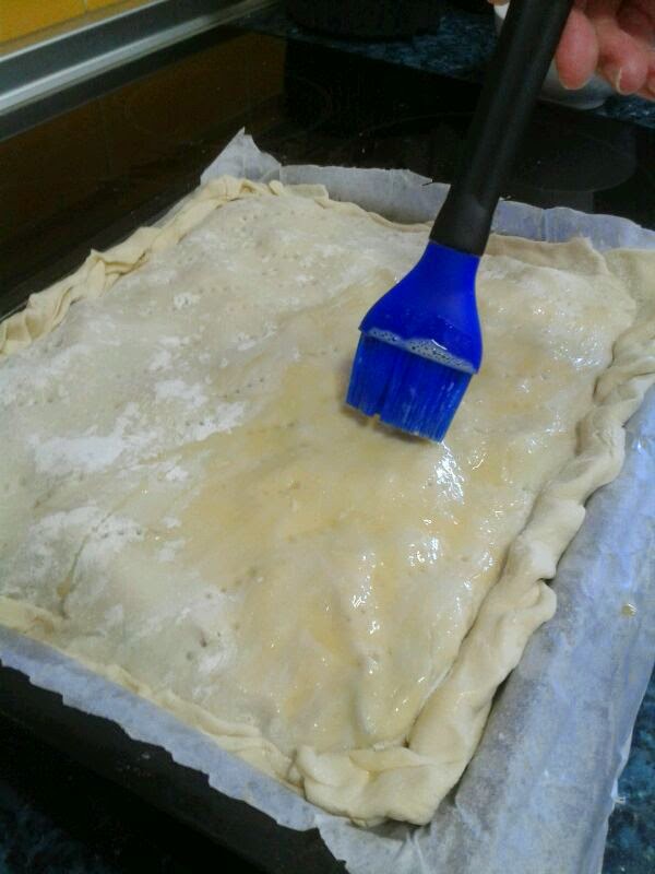 Pinchamos con un tenedor para que no suba el hojaldre y pintamos con un huevo batido.