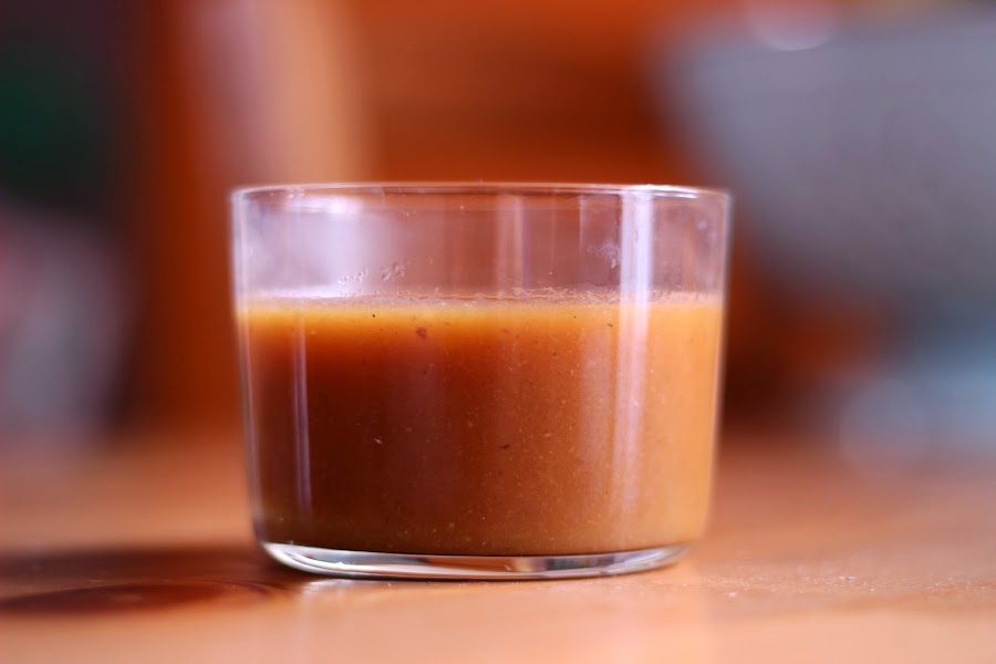 6. Mientras, hacemos la salsa. En un caldero, ponemos dos cucharadas de azúcar y cuando caramelicen echamos un chorro de vinagre. Removemos y juntamos con el líquido que nos había sobrado antes y con el zumo de una naranja (yo le puse de media). Se deja reducir la salsa, echándole una cucharadita de maicena si fuera necesario (yo lo recomiendo). La salsa queda perfecta para acompañar.
