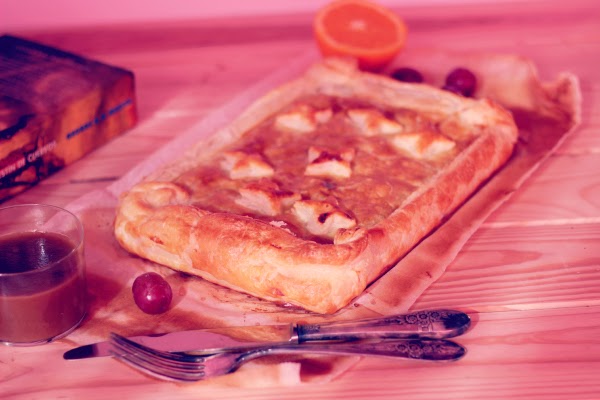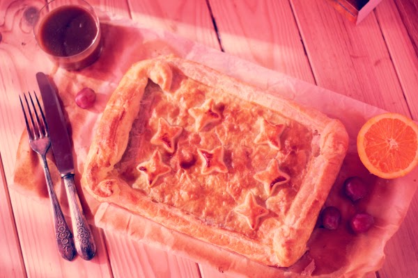 4. Precalentamos el horno a 190ºC. Mientras, rellenamos nuestra masa de hojaldre y la decoramos como queramos.