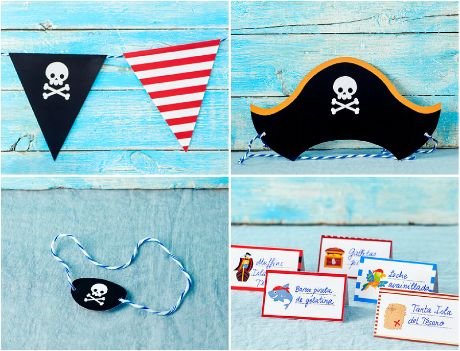 Para poner la guinda decorativa a la candy bar te proponemos una guirnalda y unas tarjetas en las que escribir el nombre de cada receta. Por supuesto, tampoco puedes olvidarte de hacer estos gorros y parches piratas.
