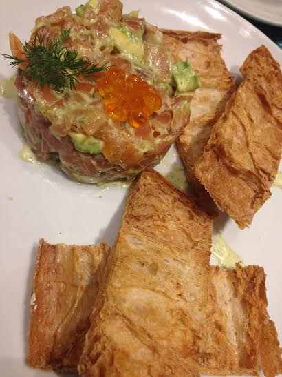 Tartar de salmón. Lo sirven con pan de crital para que cada uno se haga su montadito.