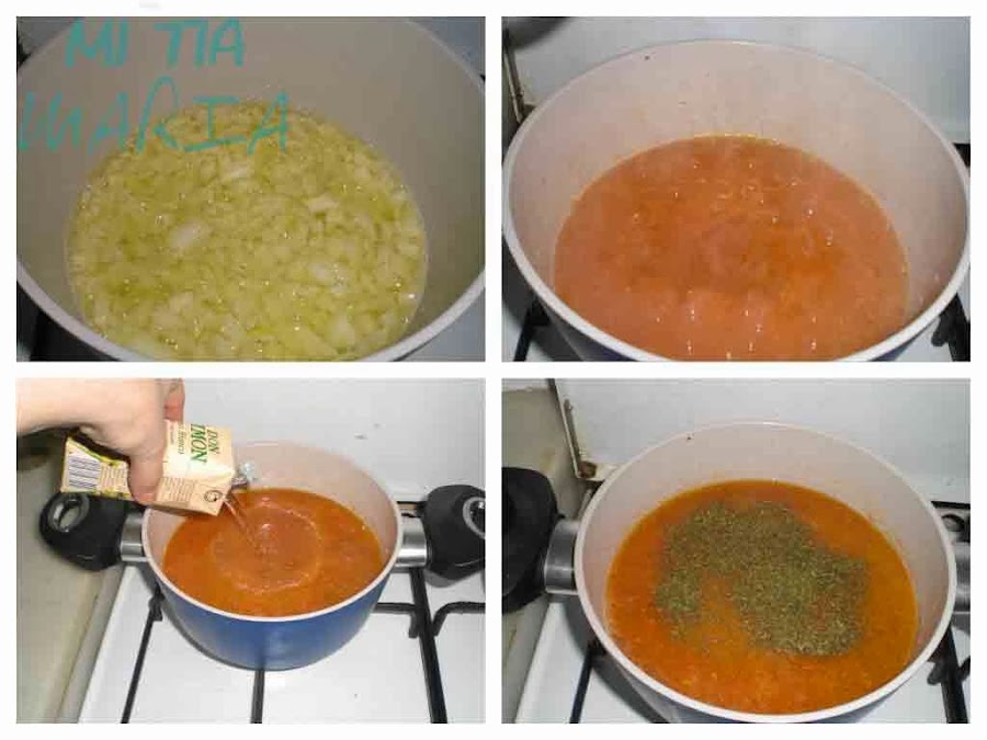 Cuando la cebolla está medio hecha añadimos el tomate (recordar ponerle azúcar para evitar acidez)