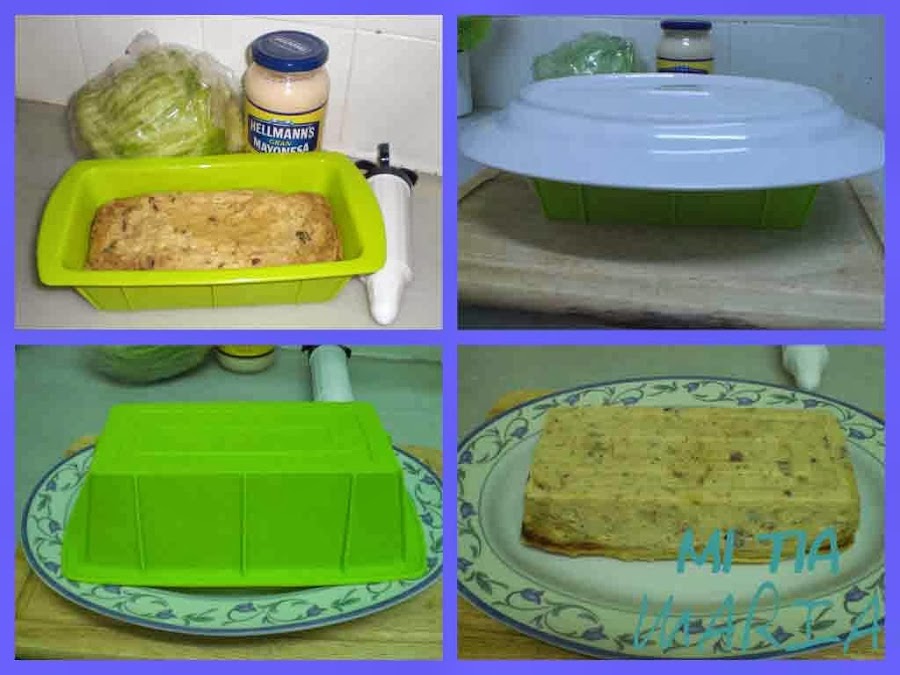 Cuando esté frío desmoldamos y decoramos con lechuga iceberg (también de productos Vivelafruta.com) y mayonesa. Yo utilizo este tipo de lechuga para las decoraciones, ya que no tiene mucho sabor pero si es muy crujiente.