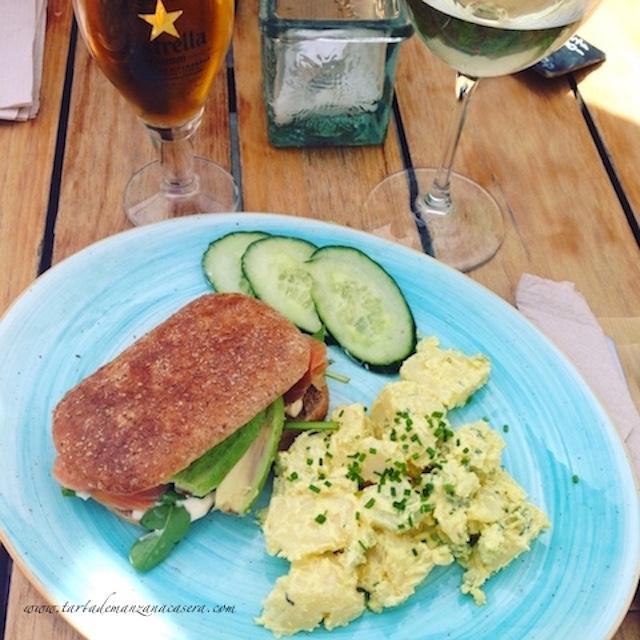 Sandwich La Más bonita: salmón y aguacate con espinacas y pepino en pan de semillas acompañado de patatas con mayonesa.