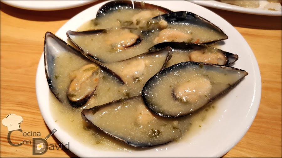 "Mejillones a la marinera". Entre sus cinco variantes nos decantamos por esta salsa. Los mejillones vienen acompañados de una salsa verde ligera, muy ricos. 3,90€