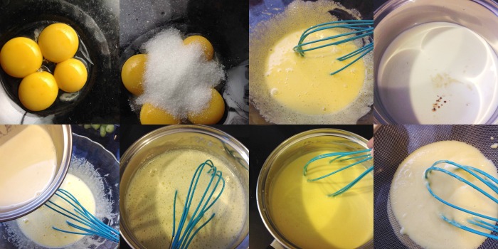 Cuando rompa a hervir la nata (crema de leche), apartamos del fuego y vamos añadiéndola a las yemas sin dejar de batir hasta que esté todo bien mezclado.