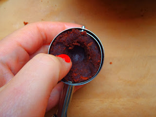 Cogemos la cuchara de helado, metemos migajas de brownie, y las apretamos, dejando un hueco en el centro. El brownie es tan jugoso que no hace falta añadirle ninguna crema