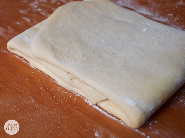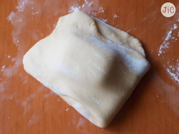- Doblamos la masa. Dividimos la masa mentalmente en tres partes. Doblamos una de las partes del extremo sobre la del centro y la restante encima. Lo dejamos reposar 20 minutos en la nevera.
