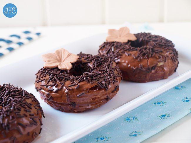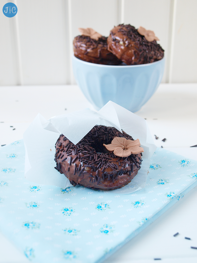 - Antes de que se seque el glaseado, echamos fideos de chocolate por encima de nuestros cronuts y decoramos con flores de fondant.