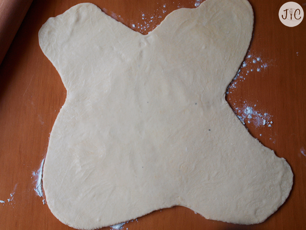 - Enharinamos una superficie y colocamos la masa encima. Con un rodillo vamos amasando cada uno de los cuartos en los que hemos dividido la masa. Estaremos formando una especie de cruz.