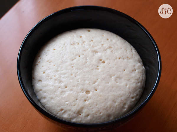 - Comenzamos con la masa madre. En un bol pequeño mezclamos y diluimos la levadura en el agua tibia.
