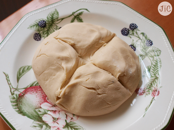 - Ponemos la masa en un plato y hacemos una bola. Le hacemos unos cortes en forma de cruz. Los cortes deben ser profundos.