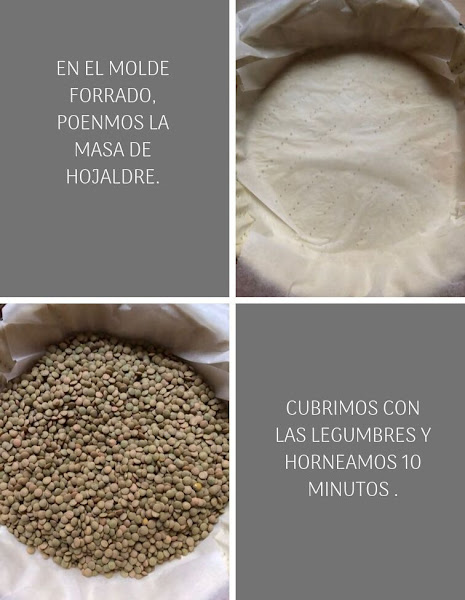 Ponemos otro papel de horno encima y echamos las legumbres. A esto se le llama hornear en blanco.