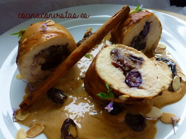 Cortamos un trozo amplio de papel film doble (de unos 25 x 40 cm) y sobre él ponemos el filete de pechuga. Le ponemos un poquito de sal y otro poquito de canela y en el centro la mitad de nuestras frutas rehidratadas, escurridas y cortadas (dejaremos algunas enteras para la presentación).
