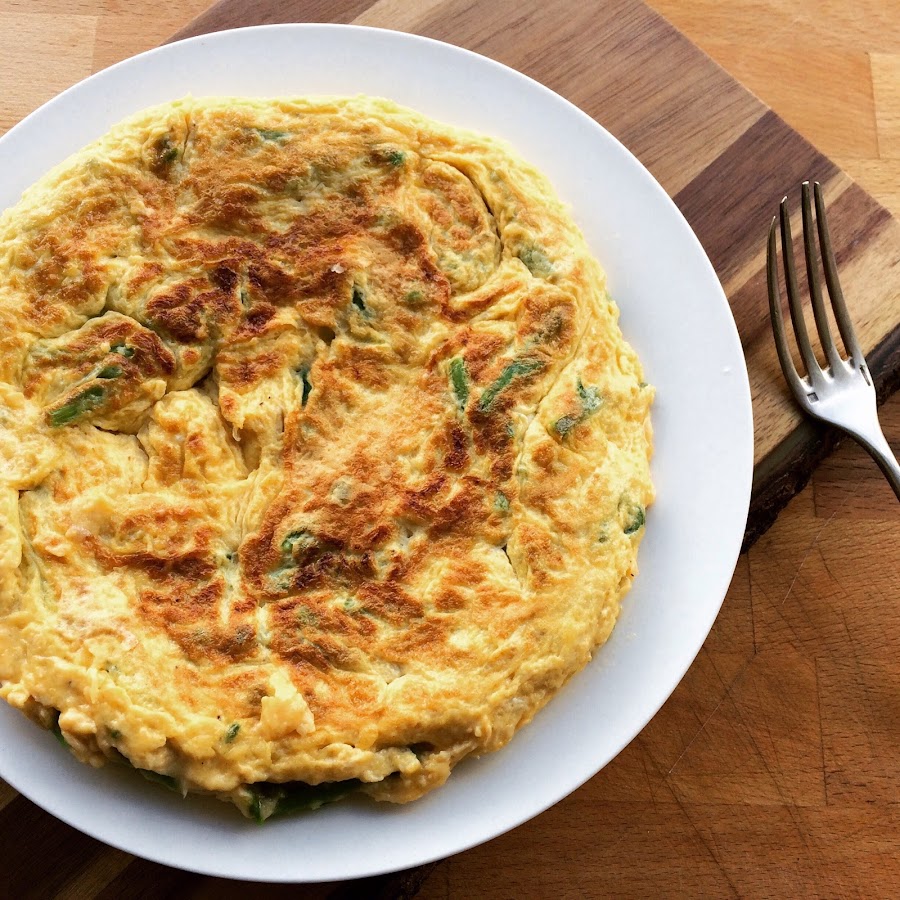 Mezcla los espárragos y el ajito con los huevos y cuaja la tortilla. Si no sabes cómo se hace, yo te explico. Pones una sartén a fuego medio-alto con un chorrete de aceite de oliva. Y añades la mezcla de huevos y trigueros cuando el aceite esté caliente. Mueve todo rápido con ayuda de una cuchara de madera o una espátula. Cuando empiece a cuajar, empieza a rodear los bordes con la cuchara y a dar forma de tortilla redonda. Mueve la sartén de vez en cuando para que no se pegue. Cuando veas cómo te gusta por dentro -Yo la prefiero poco cuajada- pon un plato encima de la sartén y dale la vuelta. Una vez la tengas en el plato (cuajada por un lado) añade otro poco de aceite a la sartén y espera que se caliente. Luego desliza la tortilla de nuevo a la sartén y dale a los bordes como antes. Espera uno o dos minutos más y sácala a un plato. ¡¡PERFECTA!!