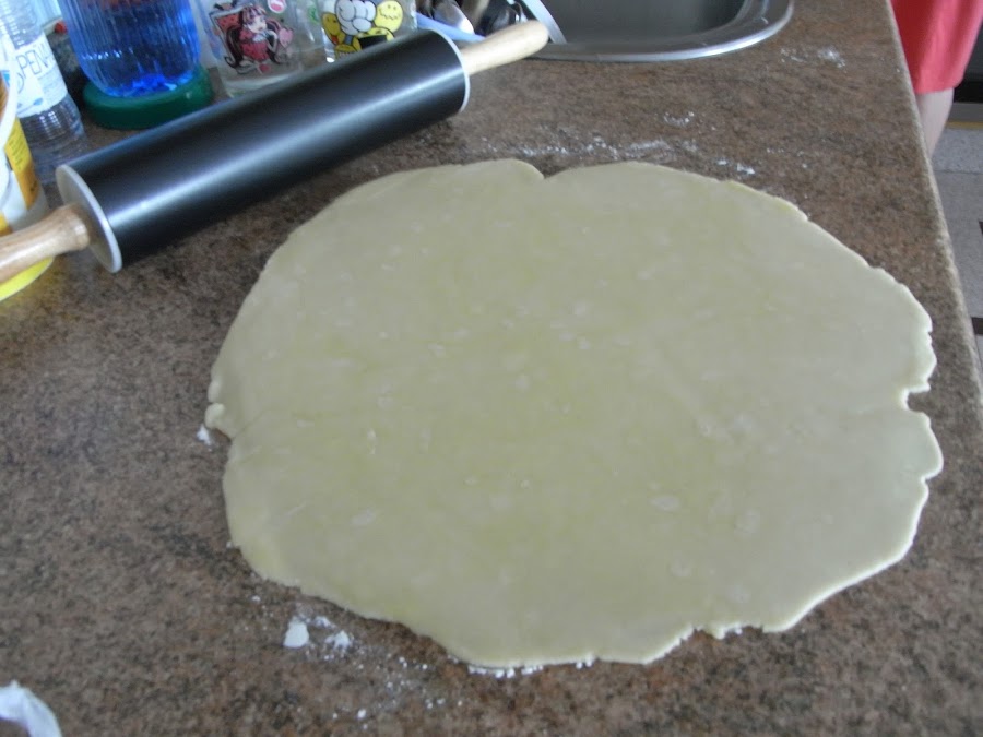 Sacamos la masa de la nevera, espolvoreamos una superficie con harina y la estiramos con un rodillo hasta que quede fina.