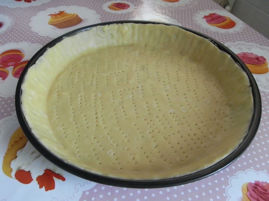 La ajustamos sobre el molde y la pinchamos con un tenedor para que no suba.