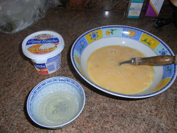 Mezclamos la clara con los demás huevos y se baten, se añade la creme fraiche y el sofrito de bacon y puerro que teníamos reservado.