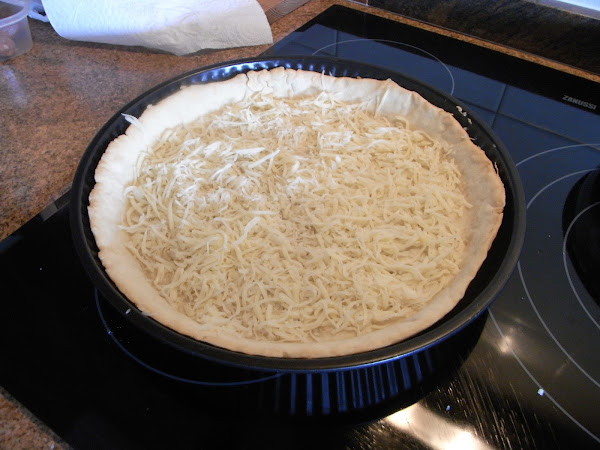 Volvemos a sacar la masa del horno, si queremos pintar la masa con mostaza ahora es el momento, ponemos el queso rallado por encima y echamos la crema flanera en la masa.