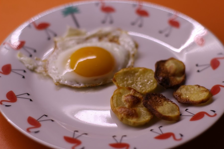 Aceite en sprayLo que más tarda en cocinarse son las patatas, por lo que es lo primero que preparo. Precaliento el horno a 180º y mientras, lavo, pelo y corto las patatas en láminas. Coloco un papel vegetal en la bandeja del horno y pongo un poco de aceite. Después pongo las patatas sobre el papel, pongo un poco mas de aceite, sal rosa del Himalaya y a veces tomillo. No suelo controlar el tiempo, así que las dejo hasta que se empiezan a dorar. Entonces las saco parase que enfríen y preparo el huevo.