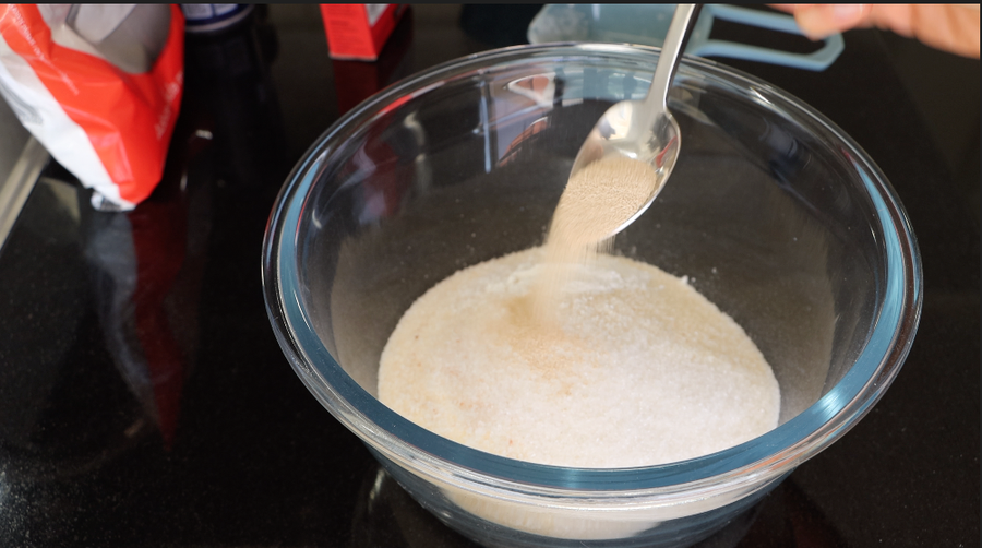 1. Mezcle todos los ingredientes secos: sémola, harina, sal, azúcar, levadura panadera y levadura en polvo. Revuelva con un batidor