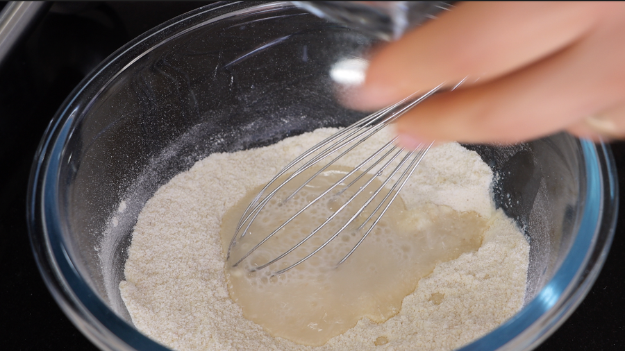 2. Agregue medio vaso de agua tibia. Mezcla. Agregue el medio vaso de agua restante. Triturar con batidora durante 4 minutos. Si es demasiado espeso, agregue agua. Dejar durante 5 minutos a temperatura ambiente.