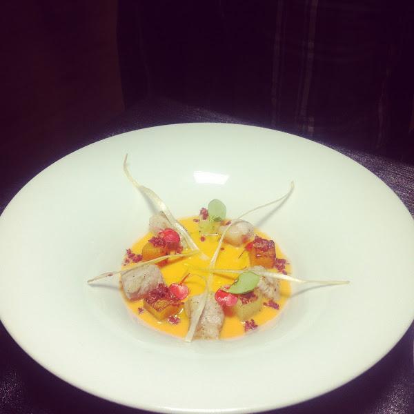 El equipo azul, con Alberto Moreno como capitán y Jesús Almagro coaching y ayudados por @Naidane, @tialia, @cocidodesopa @Naidane, @alefeldman y servidora, preparamos un "Cremoso de tomate rosa con presa ibérica de capa blanca macerada en cítricos y picual?.