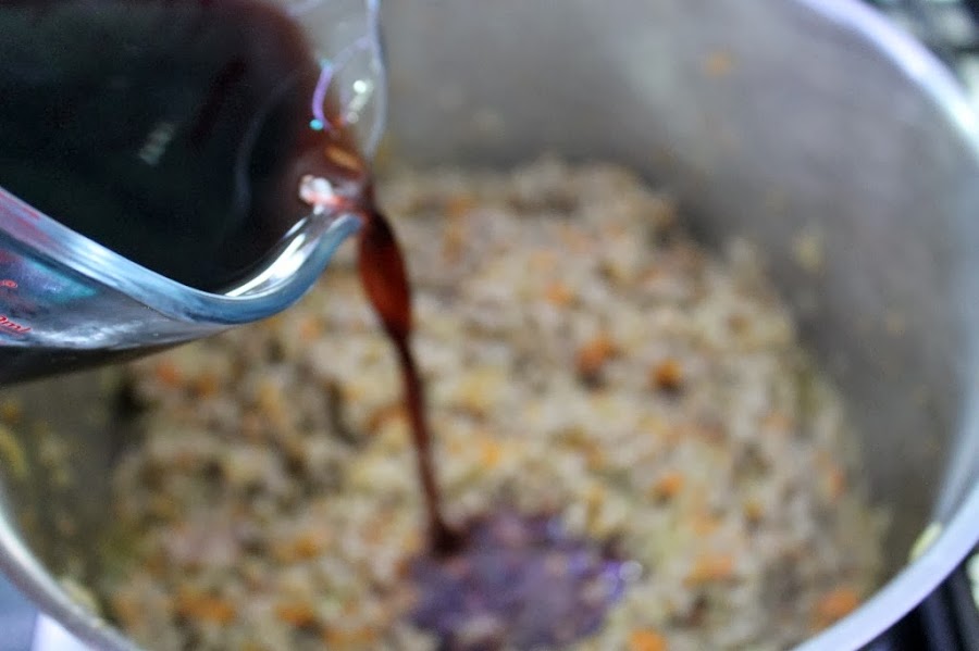 Mojamos con el vino tinto y dejamos que evapore un poco el alcohol sin dejar de remover.