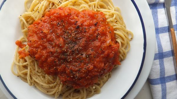 2. Cuando la salsa esté lista pruébala y sazónala al gusto con sal y pimienta. (Puede que si las cebollas no son muy dulces y los tomates son especialmente ácidos necesite un pizca de azúcar, lo sabrás si la salsa está algo ácida al finalizar la cocción). Mantén la salsa caliente mientras preparas la pasta.