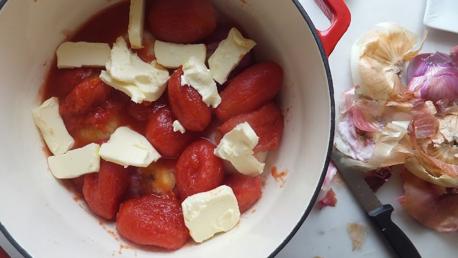 La receta que comparto hoy es el ejemplo más claro de las recetas que podréis encontrar en este libro. Una salsa de tomate tan sencilla como perfecta para la que tan solo necesitareis tres ingredientes y una cazuela. Es una salsa que a mi me pareció bastante extraña, yo diría que hasta rebelde, la primera vez que la descubrí. Para empezar y para acabar no tiene sofrito alguno. Ni de pimiento, ni de cebolla ni de ajo, ni de nada. Pensareis, como yo, que entonces tampoco puede ser tan buena y he ahí el dilema, porque lo es. Es una salsa de tomate maravillosa, con un sabor a tomate a la vez intenso y sutil. Una de las salsas de tomate más sedosas y delicadas que jamás he probado y la mejor compañia que tuvo jamás un plato de espaguetis. El secreto, como tantas otras veces, no está en la masa sino en la mantequilla. Que empuja a los tomates a desarrollar su máximo potencial como el solo el mejor coach podría hacerlo. Tenía guardada la receta desde que Smitten Kitchen, y media blogosfera, se rindieran en elogios sobre ella. El hecho de que Holland la incluyera en su libro tan solo fue la gota que colmó el vaso y la señal inequívoca de que no podía seguir ignorándola mucho tiempo más.