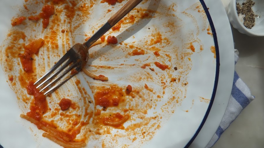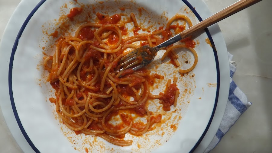 "La cocina italiana juega malas pasadas al cocinero de fuera. Dejadme que os ponga un ejemplo: todos sabemos que la comida italiana es sencilla, pero yo me tiré años u años intentando conseguir la salsa de tomate perfecta para la pasta. Hoy los espaguetis con salsa de pomodoro son mi comida casera favorita; los como en casa y en restaurantes, para asombro de muchos de mis acompañantes: "¡Pide algo más interesante! ¡Eso te lo puedes hacer en casa!", me increpaban. Pero el caso era que no podía, o al menos no con esa intensidad, con esa riqueza, dulzura o perversidad que enmascara una bondad curativa. ¿Por qué no me salía? Lo intenté todo: con y sin ajo, con cebolla en juliana, picada, sin cebolla; con semillas de hinojo, con aceite de mejor calidad con leche (por consejo de Nigella Lawson) con nata (crema de leche) (por recomendación de Martha Stewart), con orégano, azúcar... de todo.